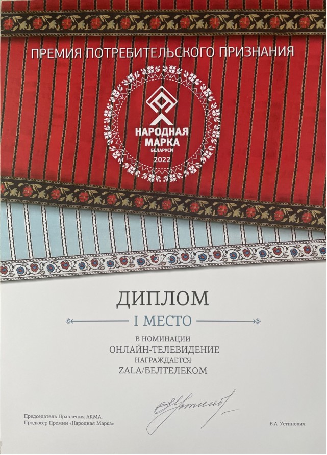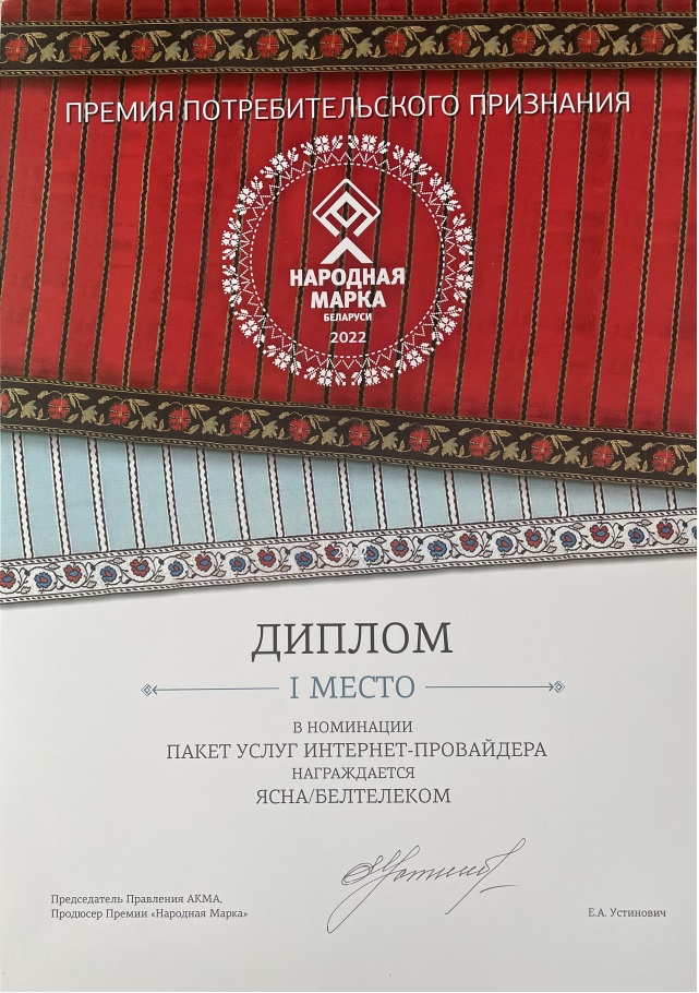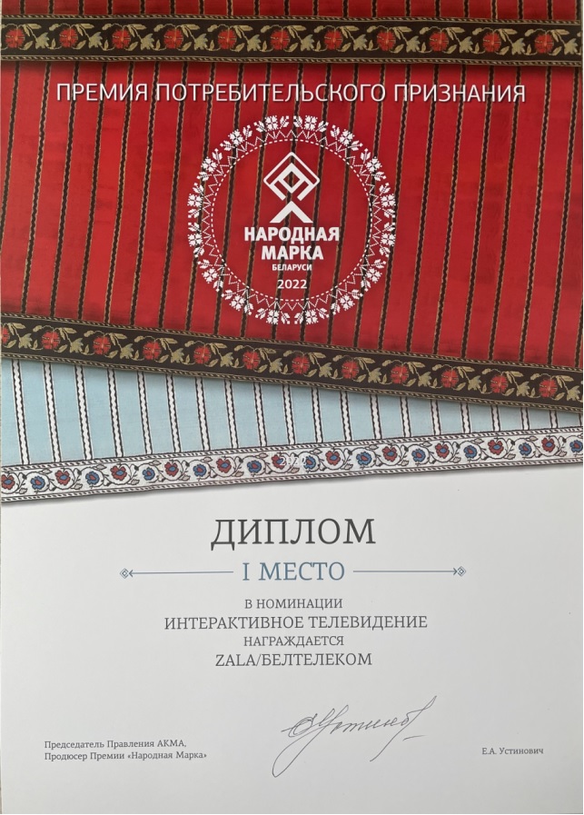 Премия Правительства Республики Беларусь за достижения в области качества РУП «Белтелеком» – ведущая компания с многолетней историей, персонал которой обеспечивает и развивает важные для государства, общества, частных и корпоративных абонентов услуги электросвязи. В своей деятельности предприятие делает ставку на активное расширение абонентской базы, внедрение и улучшение качества оказываемых услуг электросвязи. Компания динамично развивается и занимает лидирующую позицию на рынке услуг электросвязи Республики Беларусь.Для объективной оценки деятельности нашего предприятия сторонними экспертами РУП «Белтелеком» неоднократно принимало участие в конкурсе на соискание Премии Правительства Республики Беларусь за достижения в области качества. В подтверждение нацеленности всего трудового коллектива на постоянное повышение качества оказываемых услуг РУП «Белтелеком» было признано лауреатом Премии Правительства Республики Беларусь за достижения в области качества 2004, 2010, 2015, 2021 и 2024 года.В соответствии с протоколом заседания Президиума Совета Министров Республики Беларусь 09.06.2025 №22 РУП «Белтелеком» подтвердило звание лауреата Премии Правительства Республики Беларусь за достижения в области качества.Лидеры искусственного интеллекта Беларуси12 октября 2023 года по итогам конкурса «Лидеры искусственного интеллекта Беларуси» РУП «Белтелеком» награждено дипломом II степени в номинации «Компания – лидер искусственного интеллекта Беларуси».Премия потребительского признания «Народная Марка»8 декабря 2021 года по итогам Премии потребительского признания «Народная Марка» бренд «ЯСНА» занял первое место в номинации «Пакет услуг интернет-провайдера», бренд ZALA победил в номинациях «Онлайн-телевидение» и «Интерактивное телевидение». Премия потребительского признания «Народная Марка» 20231 декабря 2022 года по итогам Премии потребительского признания «Народная Марка» бренд «ЯСНА» занял первое место в номинации «Пакет услуг интернет-провайдера», бренд ZALA победил в номинациях «Онлайн-телевидение» и «Интерактивное телевидение», а также впервые компании «Белтелеком» присуждена специальная номинация – «Народное признание». Печать