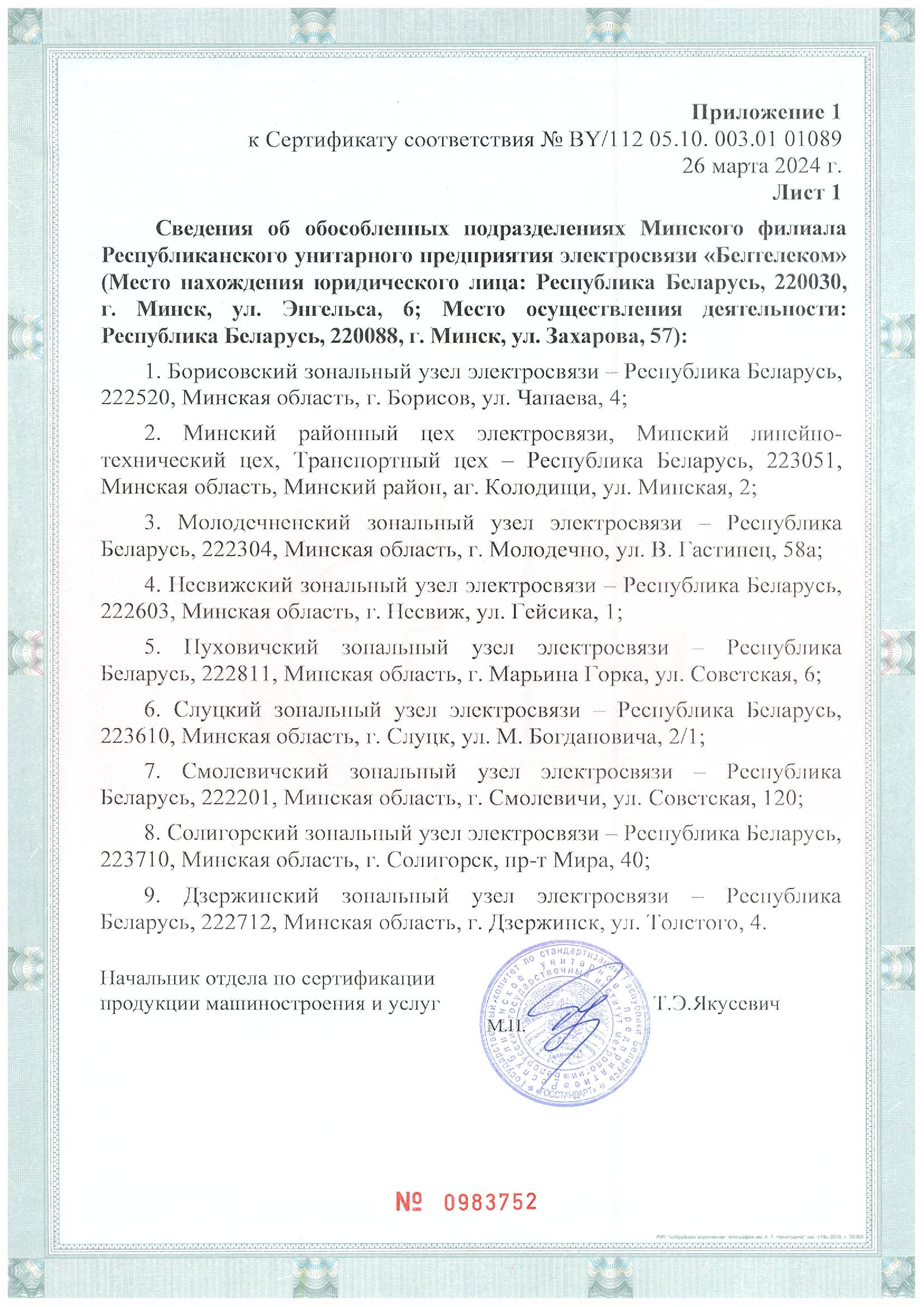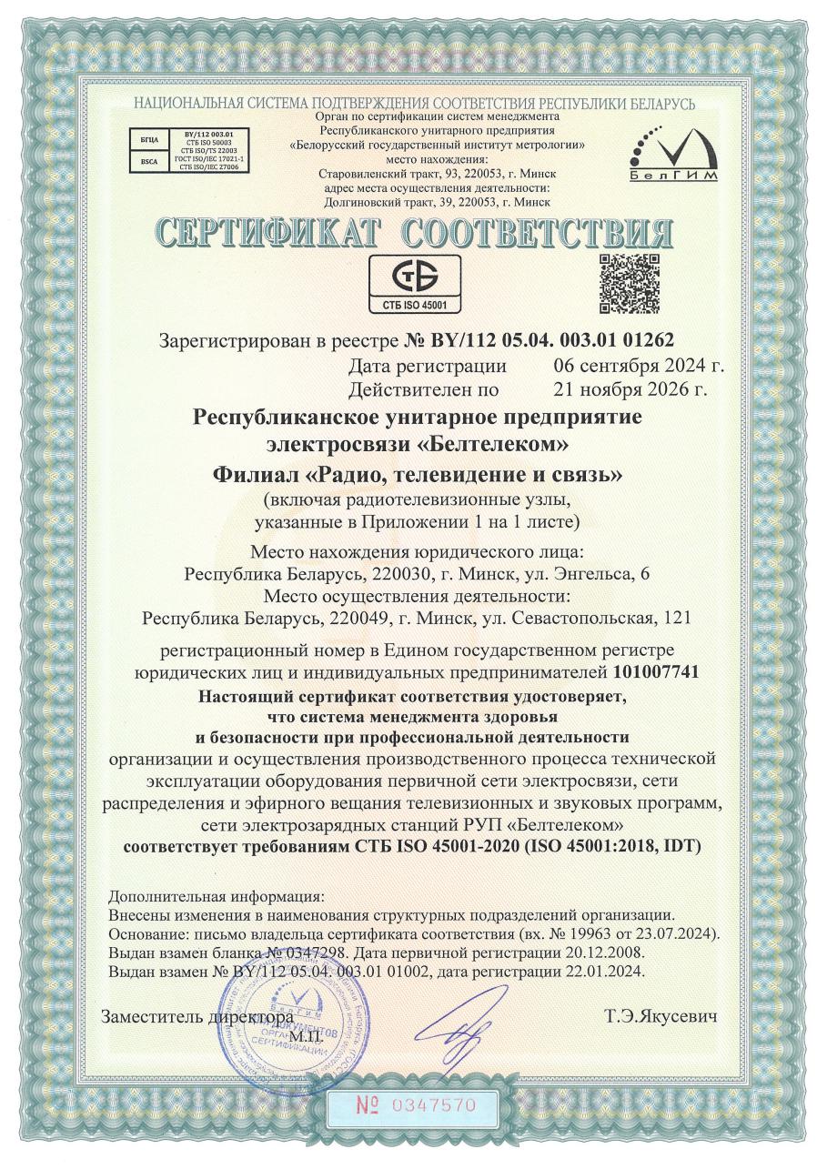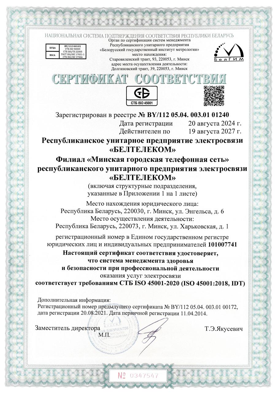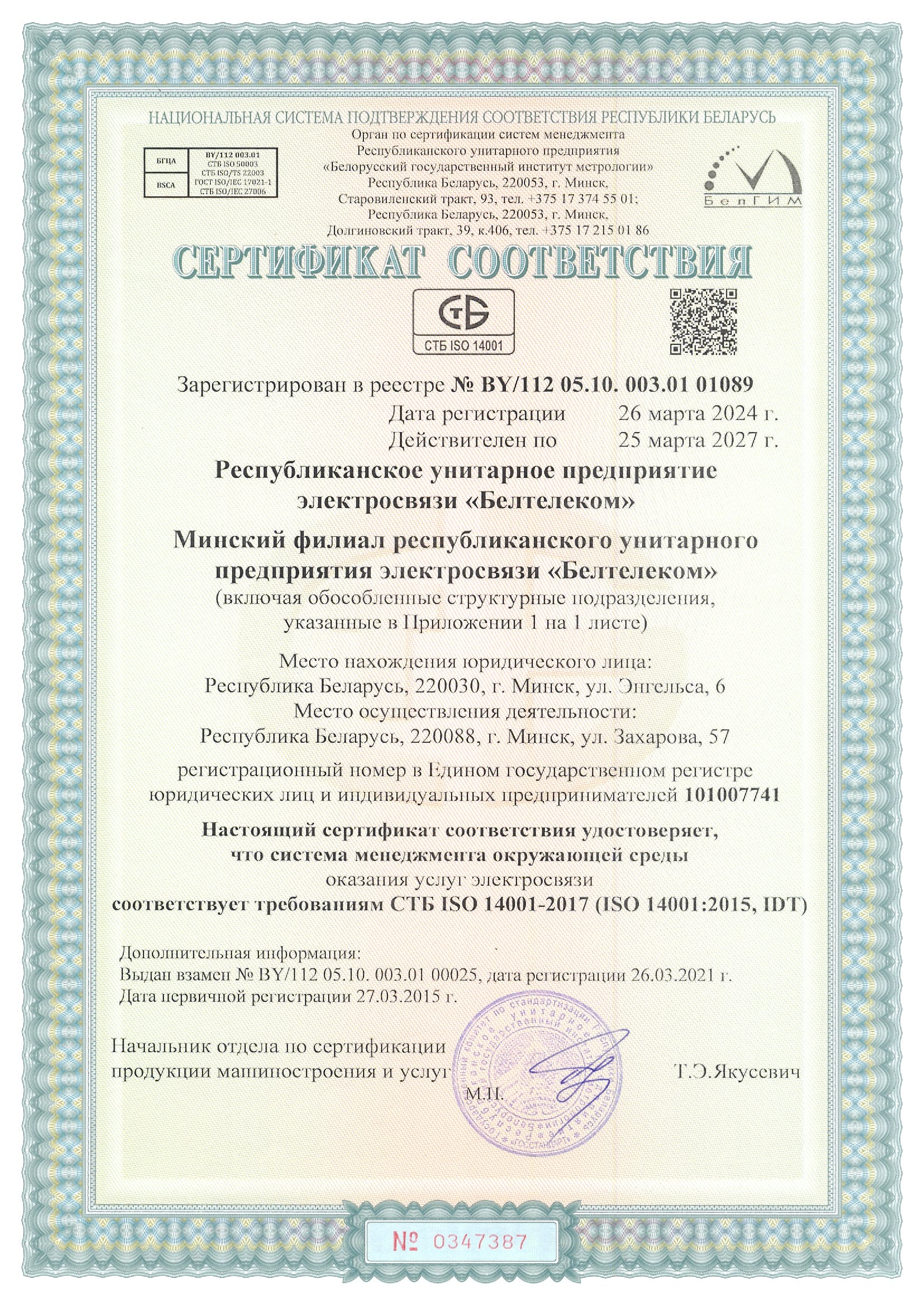 СТБ ISO 9001-2015В целях постоянного совершенствования качества оказываемых услуг и повышения удовлетворённости потребителей компании в РУП «Белтелеком» в 2003 году была впервые внедрена и сертифицирована система менеджмента качества оказания услуг электросвязи. В ноябре 2024 года компания успешно прошла повторную сертификацию системы менеджмента качества оказания услуг электросвязи на соответствие требованиям стандарта СТБ ISО 9001-2015 «Системы менеджмента качества. Требования». СТБ ISO 45001-2020В филиалах «Минская городская телефонная сеть» и «Радио, телевидение и связь» РУП «Белтелеком» системы менеджмента здоровья и безопасности при профессиональной деятельности сертифицированы на соответствие СТБ ISO 45001-2020 «Системы менеджмента здоровья и безопасности при профессиональной деятельности. Требования и руководство по применению». СТБ ISO 14001-2017В Минском филиале РУП «Белтелеком» система управления окружающей среды сертифицирована на соответствие CТБ ISO 14001-2017 «Системы управления (менеджмента) окружающей среды. Требования и руководство по применению». Печать