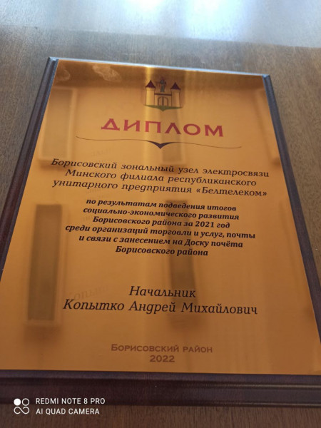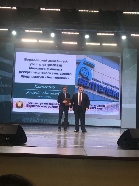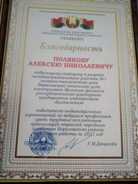 Борисовщина всегда славилась своими тружениками. 24 марта в городском Дворце культуры чествовали передовиков по итогам за 2021 год. За высокие показатели в работе Борисовский зональный узел электросвязи Минского филиала РУП "Белтелеком" награжден Дипломом и занесен на Доску почета г. Борисова. Диплом был вручен начальнику Борисовского зонального узла электросвязи Копытко Андрей Михайловичу, а так же отмечен Благодарностью Поляков Алексей Николаевич, кабельщик спайщик 6 разряда ЛТУ-1 Борисовского ЗУЭС, как победитель в индивидуальных соревнованиях по ведущим профессиям среди трудовых коллективов Борисовского района по итогам за 2021 год. Печать