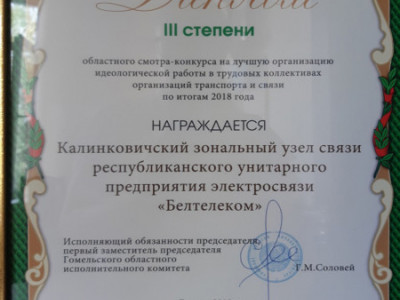 В Гомеле подвели итоги областного смотра-конкурса на лучшую организацию идеологической работы в трудовых коллективах по итогам 2018 года. Церемония награждения победителей прошла в Гомельском областном общественно-культурном центре, заслуженные награды получили 34 победителя в 11 номинациях. История смотра-конкурса насчитывает уже 14 лет. В этом году на рассмотрение жюри было представлено более 90 материалов по всем номинациям. Заместитель председателя облисполкома Владимир Привалов отметил, что сейчас сложно представить общественную жизнь страны и региона без работы идеологического актива. Роль идеолога очень актуальна, так как в центре внимания стоит забота о человеке, трудовом коллективе, социальная и моральная поддержка, а от этого напрямую зависят производственные и экономические результаты работы предприятий, благосостояние людей и страны в целом. Дипломом третьей степени смотра-конкурса была отмечена идеологическая работа, проводимая в коллективе Калинковичского ЗУЭС Гомельского филиала РУП «Белтелеком» начальником ЗУЭС Змушко Сергеем Владимировичем и ответственным за организацию идеологической работы Щербаковой Анастасией Владимировной. Печать
