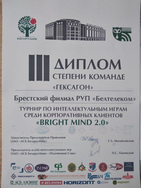 ОАО «Беларусбанк» впервые провел интеллектуальный турнир для корпоративных клиентов. Среди участников и команда Брестского филиала РУП «Белтелеком». 19 команд, больше 100 игроков со всех уголков страны на протяжении двух часов боролись за победу в игре «Bright mind 2.0». Команда «Гексагон» Брестского филиала РУП «Белтелеком» завоевала диплом 3 степени. Поздравляем участников и желаем им побольше побед! Печать