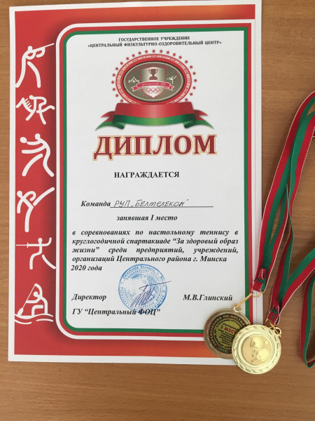 7 октября в Колледже-гимназии искусств на Коммунистической 52 состоялись соревнования по настольному теннису среди коллективов промышленных предприятий и организаций Центрального района города Минска «За физическое и нравственное здоровье трудящихся» в программе городской спартакиады. За победу боролись 6 клубов Центрального района. Места распределились следующим образом: 1 место заняла команда РУП «Белтелеком», 2 место – команда КУП «Минскхлебпром», 3 место - клуб ОАО «Белгорхимпром». Поздравляем наших теннисистов, а именно Панасенко Дмитрия, Дробову Татьяну и Карбановича Дениса, занявших первое место! Гордимся победой и желаем дальнейших успехов! Печать
