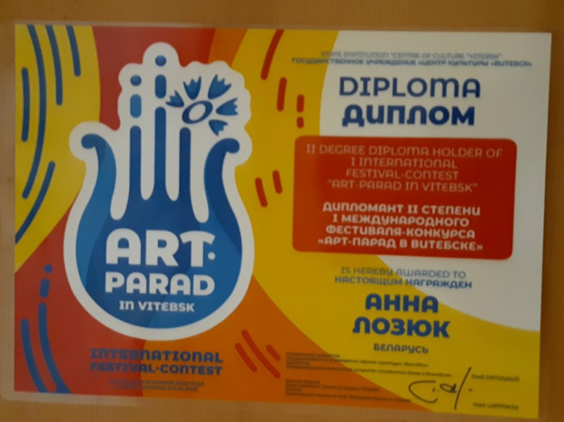 В Витебске 10 января 2020г. завершился I Международный фестиваль-конкурс "Арт-парад в Витебске". Организаторами конкурса выступили Дирекция Международного фестиваля искусств «Славянский базар» и Государственное учреждение «Центр культуры «Витебск». Поучаствовать в проекте, который уже окрестили зимним спутником «Славянского базара», изъявили желание более 900 исполнителей из Беларуси, России, Украины, Казахстана, Латвии, Литвы, Израиля и Китая. Творческие коллективы и исполнители, которым от 7 до 25 лет, боролись за победу в номинациях «Вокал» и «Хореография». Обширная программа фестиваля позволила участникам не только продемонстрировать свое мастерство на конкурсных площадках, но и посетить мастер-классы и познакомиться с одним из красивейших городов Беларуси - Витебском. Нам очень приятно, что юная звёздочка Анна Лозюк - дочь начальника административно-хозяйственного отдела Брестского филиала РУП "Белтелеком" Лозюка Ивана Григорьевича - стала дипломантом 2 степени!!! От души поздравляем Анечку и ее родителей и желаем дальнейших творческих успехов! Спасибо организаторам фестиваля за высокий уровень его проведения, теплоту встреч и внимание к детям! Счастливые улыбки на их лицах, творческое вдохновение, масса эмоций тому яркое подтверждение. Печать