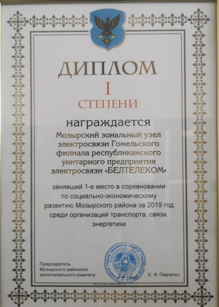 Мозырский зональный узел электросвязи стал победителем районного соревнования среди трудовых коллективов Мозырщины по социально-экономическому развитию Мозырского района за 2019 год среди организаций транспорта, связи и энергетики. Обеспечение качественной связи и внедрение новых технологий - именно эти критерии стоят во главе угла деятельности коллектива Мозырского зонального узла электросвязи филиала РУП «Белтелеком», который на протяжении ряда лет возглавляет Александр Николаевич Болсун. Профессионализм, ответственность, добросовестное отношение к своим обязанностям каждого работника позволили коллективу стать победителем соревнований по социально-экономическому развитию Мозырского района за 2019 год среди организаций транспорта, связи и энергетики. При Мозырский зональный узел электросвязи опубликовала статью районная газета "Жыцце Палесся: "https://www.mazyr.by/2020/03/obespechenie-kachestvennoj-svyazi-i-vnedrenie-novyx-texnologij/ Печать