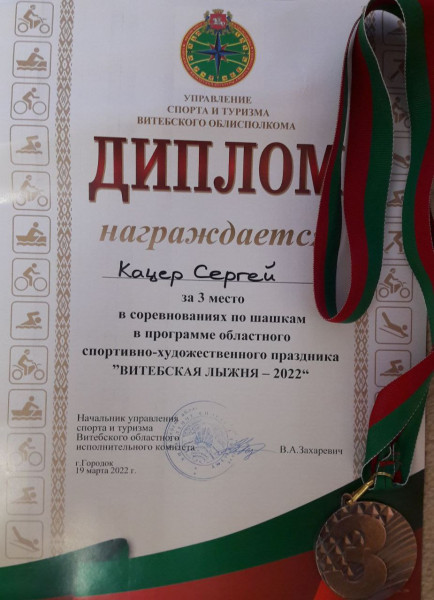 Поздравляем Кацера Сергея, электромеханика связи Сенненского узла электросвязи Витебского филиала, занявшего с 3-е место в соревнованиях по шашкам, которые проходили 19 марта в рамках спортивно-художественного праздника "Витебская лыжня-2022". Более 70 команд со всей области собрались в этот день в урочище Воробьевы горы в Городке, чтобы проверить свою физическую подготовку, пообщаться и зарядиться позитивными эмоциями. Печать