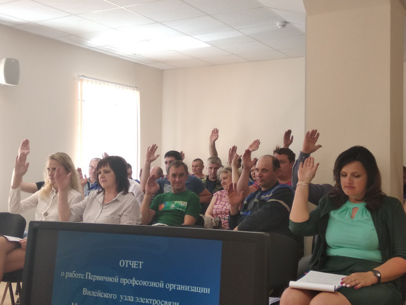 21 мая 2019 года состоялось отчетно-выборное собрание первичной профсоюзной организации Вилейского УЭС Минского филиала РУП «Белтелеком». На учете в первичной профсоюзной организации состоит 116 членов профсоюза, из них 64 работника и 52 бывших работника, ныне пенсионера. Все работники являются членами профсоюза. В работе отчетно-выборного собрания первичной профсоюзной организации Вилейского УЭС Минского филиала РУП «Белтелеком» приняли участие председатель первичной профсоюзной организации Минского филиала РУП «Белтелеком» Трощинская Наталья Иосифовна, ведущий специалист первичной профсоюзной организации РУП «Белтелеком» Цапикова Марина Владимировна, председатель Вилейского районного объединения профсоюзов Шляпо Ольга Александровна. Председатель первичной профсоюзной организации Вилейского УЭС Яцкевич Наталья Владимировна доложила о работе профсоюзного комитета первичной профсоюзной организации Вилейского УЭС Минского филиала РУП «Белтелеком» за период с 24 декабря 2014 года по 21 мая 2019 года. На отчетно-выборном собрании был избран профсоюзный комитет, председатель первичной профсоюзной организации, ревизионная комиссия, общественные инспекторы. Председателем первичной профсоюзной организации Вилейского УЭС Минского филиала РУП «Белтелеком» единогласно избрана Яцкевич Наталья Владимировна, инженер электросвязи участка продаж услуг Молодечненского ЗУЭС Минского филиала РУП «Белтелеком». Поздравляем коллектив Вилейского УЭС с успешным проведением отчетно-выборного собрания и желаем вновь избранному профсоюзному комитету плодотворной работы и успехов. Печать