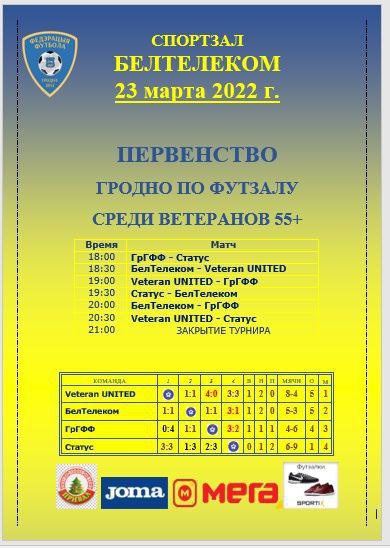 23 марта прошло первенство г.Гродно по футзалу среди ветеранов 55+. Команда Гродненского филиала РУП "Белтелеком" приняла участие в первенстве, согласно календарного плана спортивно-массовых мероприятий на 2022 год. Капитан команды - Юрий Кунцевич, заместитель начальника ЭТЦС. В первенстве приняло участие 4 команды. В результате упорной борьбы команда Гродненского филиала РУП "Белтелеком " заняла 2 место. Поздравляем!!! Печать