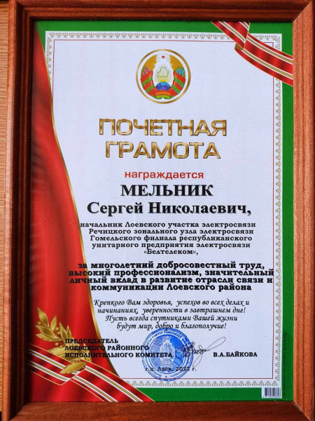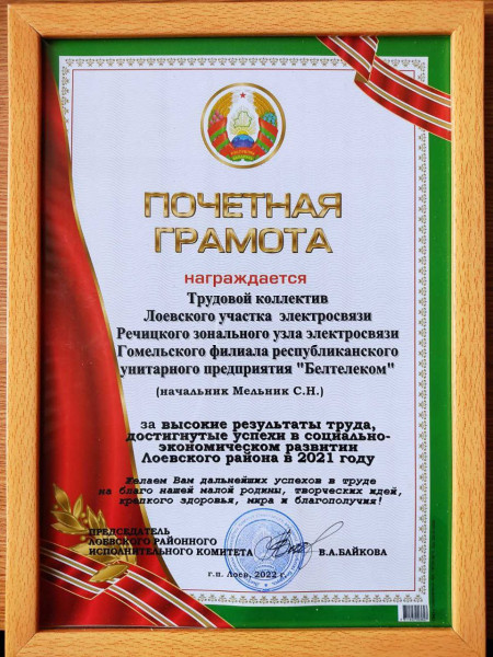 Торжественное мероприятие, посвященное подведению итогов социально-экономического развития Лоевского района за 2021 год "Трудом заслуженный почет", состоялось сегодня в городском центре культуры. Почетными грамотами наградили начальника Лоевского участка электросвязи Мельника Сергея Николаевича и трудовой коллектив Лоевского участка. Так держать! Печать