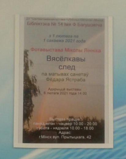 С 1 февраля по 1 марта 2021 года в Библиотеке № 14 имени Ф.Богушевича по адресу ул.Притыцкого, 42 пройдет фотовыставка Николая Линника. Николай Михайлавич Линник родился в деревне Поричи на Воложиншчине. Окончил Минский радиотехнический инстутит. Почти 40 лет проработал инженером в филиале «Междугородняя связь» РУП «Белтелеком». Сейчас на заслуженном отдыхе. Возглавляет фотокружок «Позитив» при Центральной библиотеке им. Я. Купалы, участник литературно-музыкального объединения «Аккорд», литературного объединения «ЛітЭра», поэтического театра «АртС». Фотографией и журналистикой занимается больше 55 лет. За это время им было организовано 48 персональных фотавыставок. На создание выставки «Радужный свет» Николая Михайловича вдохновили сонеты Федора Ястреба. Фёдор Ястреб (Франц Адамович Ястреб 1953-2014) - белорусский художник европейского уровня, искусствовед, педагог, лидер международной гильдии живописцев, автор художественно-публицисти- ческих артикулов, эссе,очерков. Презентовал книгу "Искусство в социальном пространстве". Оставил после себя богатое наследство. Картины хранятся в Беларуси, за рубежом и в частных коллекциях. В предпоследний год жизни (после тяжёлой болезни) открылась ещё одна грань таланта Фёдора Ястреба. На протяжении 2012-2013 г. он написал около 1000 сонетов. Совершенство и выразительность мысли и образа, философская наполненность рифмы открыли нам и очень серьёзного поэта. Издано 5 томов сонетов этого уникального автора. Вот один из них: Калі цябе адольвае маркота, Яе, як злую фею, прагані І запалі тры свечкі, тры агні, І хай агнём напоўніцца істота. Агонь атуліць, напаўзе дрымота, І ўбачыш сон: ты на гнядым кані Ляціш туды, дзе сонца прамяні Цябе аблашчаць, агарнуць пяшчотай… Ах, сон — збавенне ад зямных турбот І невыказнай лёгкасці палёт, І вобразаў размытых дух сакральны! А можа і не сон, а іншы свет, Ён побач, ды яго не знойдзеш след, І можа, гэты свет — такі ж рэальны?! Выставка работает пн-чт с 10.00 до 20.00 сб.-вс. с 10.00 до 18.00 Печать