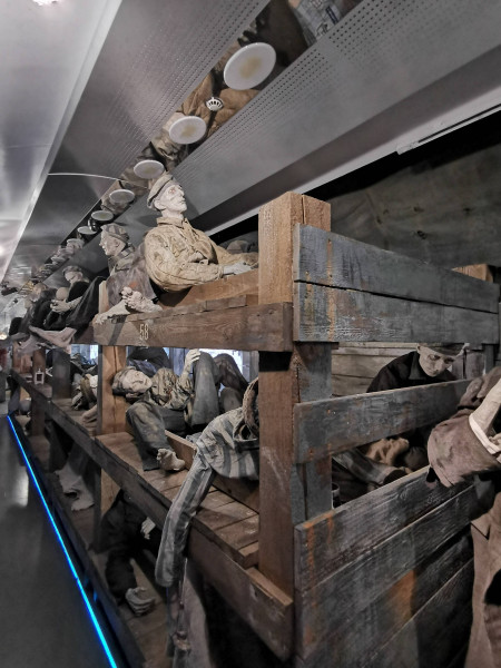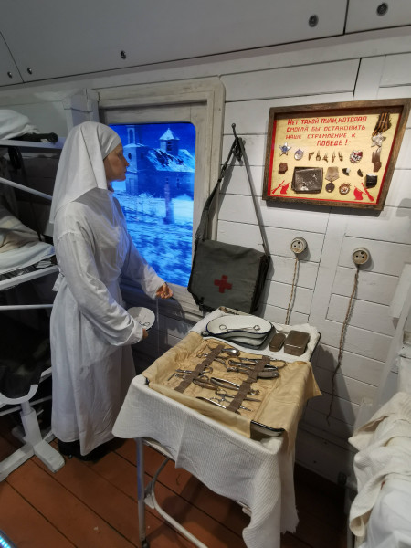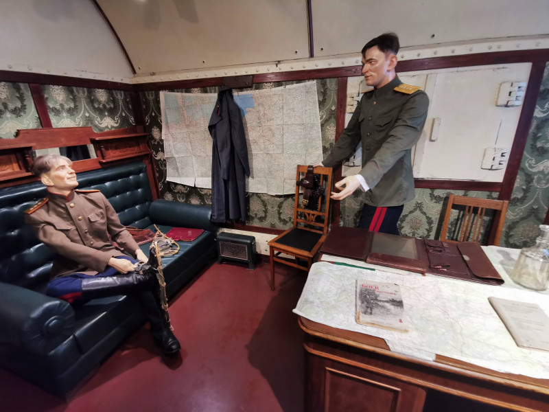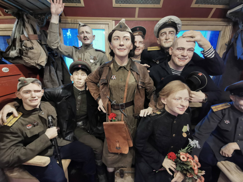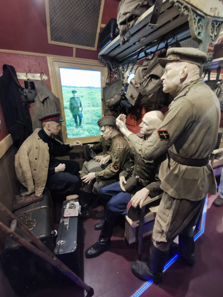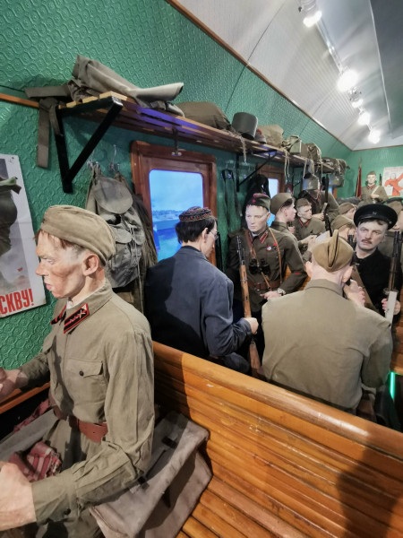 Работники Брестского филиала РУП «Белтелеком» посетили Поезд Победы, прибывший на Брестский железнодорожный вокзал в преддверии памятной даты 22 июня – Дня всенародной памяти жертв Великой Отечественной войны. В нашей стране проект реализуется Белорусской железной дорогой и ОАО «Российские железные дороги» в рамках Года народного единства и приурочен к 80-летию начала Великой Отечественной войны. Он осуществляется при поддержке Администрации Президента Республики Беларусь и активном содействии Республиканского волонтерского центра. 80 лет назад на вокзале мирно стояли составы, кипела жизнь, но сутки спустя все изменилось. началась война. Для Бреста она закончилась в июле 1944-го, а для всей великой советской страны – лишь в сентябре 1945-го. «Поезд Победы» – дань памяти тем, кто сложил свои головы на фронтах Второй Мировой войны. В составе поезда – 12 вагонов, девять из которых отведены под экспозицию разных времен войны – от мирных дней в июне 1941-го до победного марша из капитулировавшего Берлина. Есть и вагон, посвященный обороне Брестской крепости. На протяжении всей экспозиции гостей сопровождает женский голос аудиогида – машинистки Лидии, которая прошла через всю войну. Она провела посетителей по всем вагонам Поезда Победы и поведала свои воспоминания о мужестве, подвиге, страданиях, великой цели – одержать победу и о цене, отданной за мирное небо над головой. У Лидии есть реальный прообраз – уроженка Беларуси Елена Чухнюк, машинист гомельского локомотивного депо, водившая в период Великой Отечественной войны воинские эшелоны с оружием и боеприпасами к линии фронта. «Поезд Победы» основан на эффекте присутствия. Эпизоды войны сопровождаются театральным светом, мультимедийными технологиями и панорамами в виртуальной реальности – все для того, чтобы история войны звучала и на языке молодежи. Экспозиция и уровень сопровождения в нем впечатляют. Аудиогид запускается при входе в каждый вагон, где находится своя экспозиция. Внутри – не только трехмерные экспонаты-фигуры, но и мультимедийные экраны, и тач-столы, и объемный звук, и театральное освещение, и спецэффекты, и голограммы, и панорамы боев в виртуальной реальности (VR). Для каждой зоны экспозиции специально написана своя музыка. Все эффекты создают полную иллюзию движения поезда, хотя тот стоит. Это движение – сквозь 80 лет, прошедших с начала Великой Отечественной… В первом вагоне беззаботные люди играют в шахматы, читают книги, обедают и весело смеются, знакомятся, играют со своими детьми. Они радуются жизни, мечтают и ещё не подозревают, что скоро всё совсем изменится. Во втором вагоне – страх и ужас в глазах гражданских. Совсем молодые мальчишки едут защищать Родину, на их лицах – тень тревоги, а в руках по медальону с адресом внутри – это для того, чтобы знать, куда высылать похоронку. Пройдя немного, посетители оказываются в самом настоящем окопе – эпицентре боевых действий. Вокруг раненые, обломки оружия и развороченная земля. Тем временем, Брестская Крепость храбро держит оборону. Надпись на красной кирпичной стене гласит «Умираем не срамя». Третий вагон полон узников, которых везут в концлагерь. Большое счастье исстрадавшимся людям примоститься на наспех сколоченных жёстких нарах, ведь зачастую замученным пленным приходилось провести весь путь стоя. 