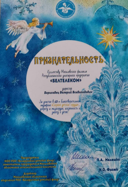 10 марта коллективу Могилёвского филиала РУП Белтелеком вручена "Признательность", за участие в 10-м благотворительном марафоне "Согреем детские сердца", доброту и милосердие, искренность и заботу о детях. Марафон проходил в период с 14 декабря 2021 по 14 января 2022. Награда вручена председателем Могилёвского областного объединения РОО "Белорусский детский фонд" заместителем председателя Могилёвского областного исполнительного комитета Валерием Анатольевичем Малашко. Благодарим коллектив Могилёвского филиала РУП Белтелеком за добрые сердца. Печать