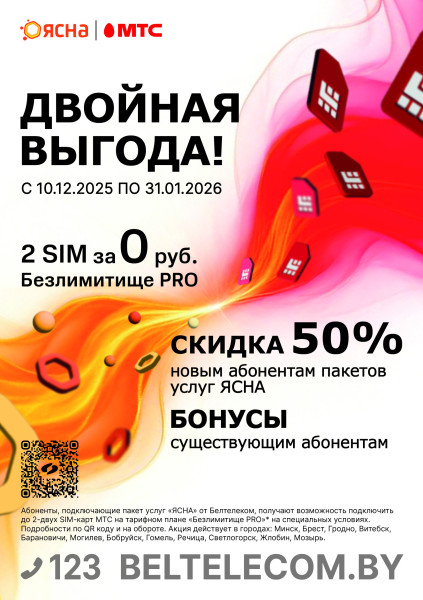 Толькі да 31 студзеня 2026 года новым абанентам у Брэсце і Баранавічах — 50% зніжка на пакет «ЯСНА» і дзве SIM-карты МТС з тарыфам «Безліміцішча PRO» за 0 рублёў у першы год!*
