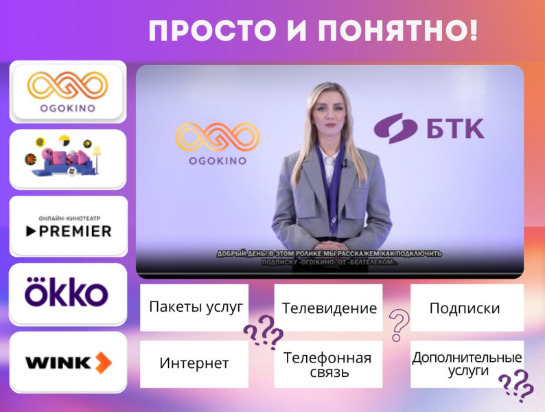 Асобны блок матэрыялаў прысвечаны актывацыі падпіскі на анлайн-кінатэатры. У роліках падрабязна асвятляюцца этапы афармлення заяўкі, падключэння паслугі, аўтарызацыі ў ўліковым запісе і пачатку прагляду кантэнту ў сэрвісах «Ого!Кіно», «Яндекс Плюс», Premier, Okko і Wink.