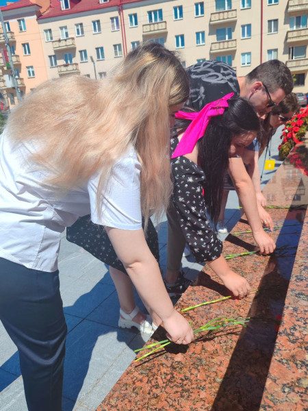 Сёння, да мемарыяльнага комплексу горада "Вечны агонь" прыйшлі прадстаўнікі БРСМ Гомельскага філіяла РУП "Белтэлекам" для таго, каб ушанаваць памяць загінуўшых герояў Вялікай Айчыннай вайны і ўскласці кветкі.