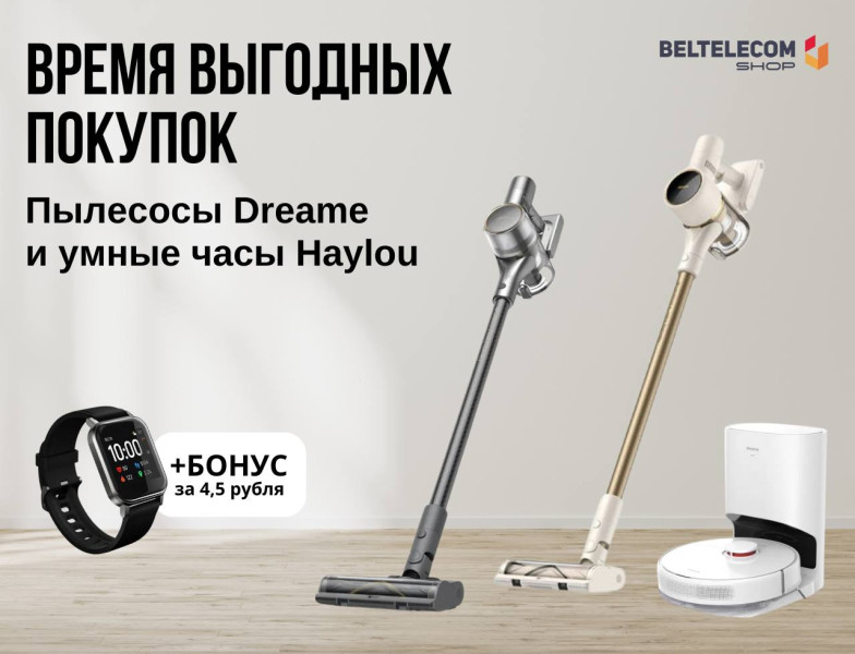 Пры куплі любога з пыласосаў Dreame Вы атрымаеце бонус - разумны гадзіннік Haylou LS02 усяго за 4,5 рубля. Пыласосы Dreame даступныя для набыцця ў растэрміноўку на 18 месяцаў для абанентаў "Белтэлекам"*.