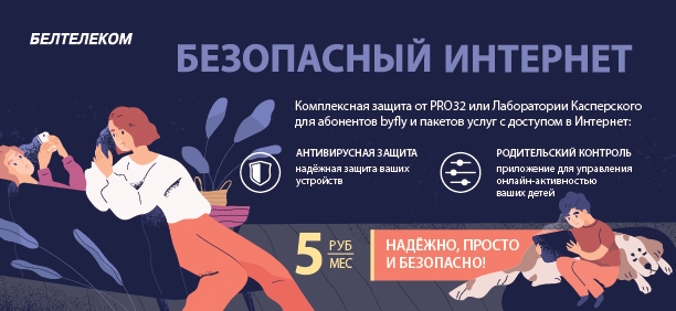 - "Бяспечны інтэрнэт": https://www.beltelecom.by/private/internet/additional-service/safe-inte ... - абарона ад шкоднасных праграм і фішынгу, абарона дзяцей ад негатыўнага ўплыву лічбавага свету.