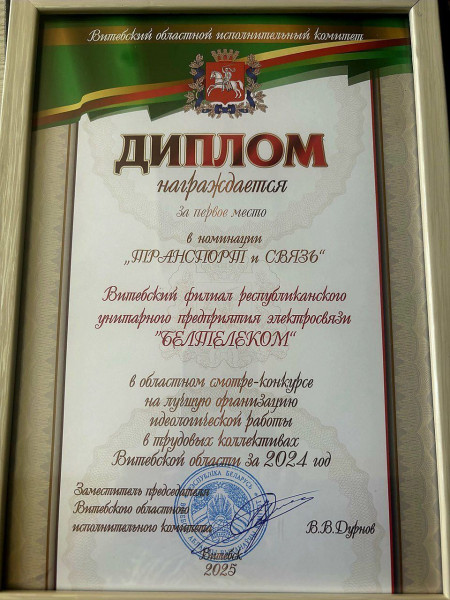 1 месца ў абласным аглядзе-конкурсе на лепшую арганізацыю ідэалагічнай работы ў працоўных калектывах Віцебскай вобласці за 2024 год у намінацыі "Транспарт і сувязь".