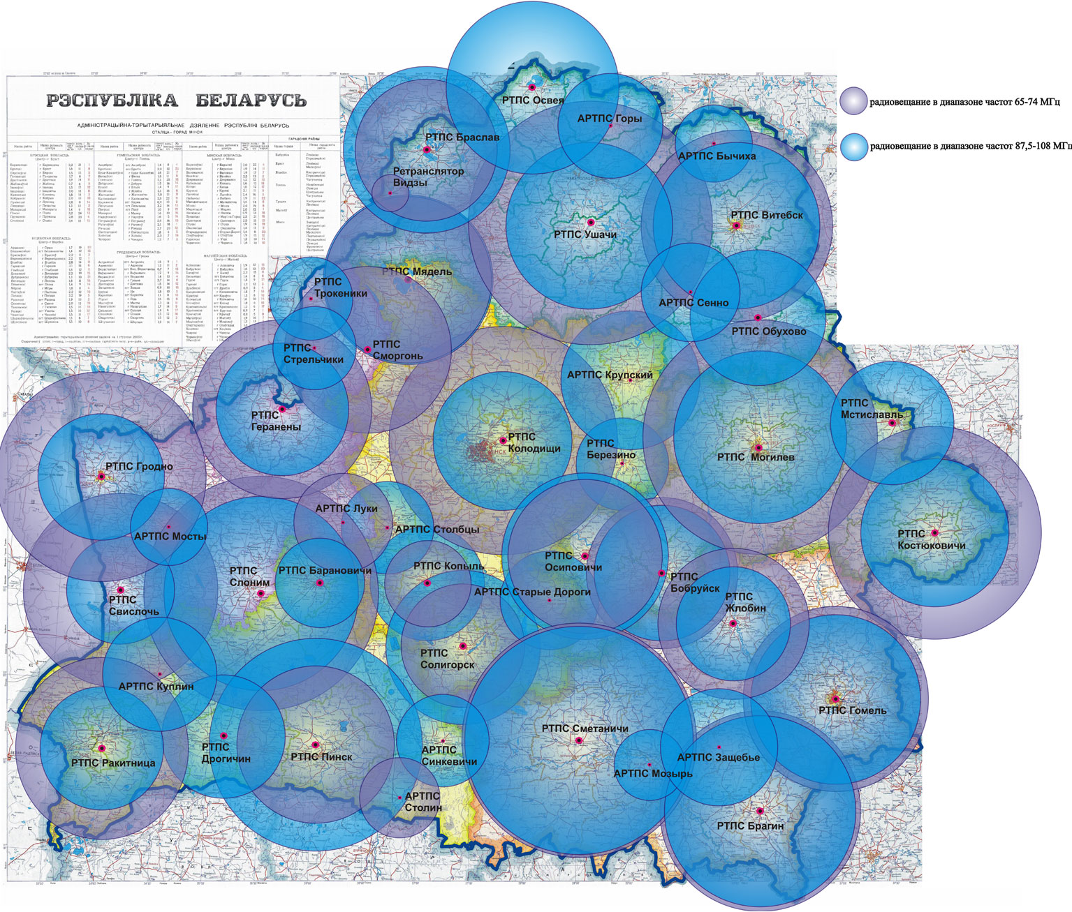 Область Передающая станция Частота, МГц Радиус зоны охвата, км Брестская РТПС Барановичи 105,20 29 Брестская АРТПС Пружаны (Куплин) 103,10 37 Брестская РТПС Ракитница 71,69 56 Брестская РТПС Ракитница 88,50 40 Брестская РТПС Дрогичин (Сиреневка) 101,80 40 Брестская АРТПС Синкевичи 103,60 30 Брестская АРТПС Столин 73,79 26 Брестская РТПС Пинск (Посеничи) 67,10 51 Брестская РТПС Пинск (Посеничи) 106,80 69 Витебская РТПС Браслав 71,99 46 Витебская РТПС Браслав 107,70 54 Витебская АРТПС Видзы эфирная трансляция прекращена Витебская АРТПС Бычиха 101,80 25 Витебская РТПС Витебск 69,92 62 Витебская РТПС Витебск 99,30 54 Витебская РТПС Обухово (Орша) 105,00 44 Витебская АРТПС Сенно 104,20 32 Витебская АРТПС Горы 103,10 34 Витебская РТПС Освея 106,00 56 Витебская РТПС Ушачи (Островенец) 66,74 79 Витебская РТПС Ушачи (Островенец) 101,70 54 Гомельская РТПС Брагин 68,30 65 Гомельская РТПС Брагин 105,80 62 Гомельская РТПС Гомель 69,26 60 Гомельская РТПС Гомель 91,50 55 Гомельская АРТПС Защебье 106,50 38 Гомельская РТПС Жлобин 71,03 49 Гомельская РТПС Жлобин 101,00 37 Гомельская АРТПС Мозырь 103,50 23 Гомельская РТПС Сметаничи 68,00 76 Гомельская РТПС Сметаничи 104,60 74 Гродненская РТПС Геранены 68,39 58 Гродненская РТПС Геранены 102,20 43 Гродненская АРТПС Луки 94,70 32 Гродненская РТПС Гродно 66,20 68 Гродненская РТПС Гродно 95,00 41 Гродненская АРТПС Мосты 102,70 25 Гродненская РТПС Свислочь 66,08 63 Гродненская РТПС Свислочь 98,90 35 Гродненская РТПС Слоним 67,34 76 Гродненская РТПС Слоним 97,30 63 Гродненская РТПС Сморгонь 70,13 54 Гродненская АРТПС Стрельчики 100,30 27 Гродненская АРТПС Трокеники 70,76 27 Минская РТПС Копыль 70,97 28 Минская РТПС Копыль 101,60 37 Минская АРТПС Столбцы 100,70 30 Минская АРТПС Березино 107,40 30 Минская АРТПС Крупский 106,30 45 Минская РТПС Колодищи 70,43 74 Минская РТПС Колодищи 102,90 45 Минская РТПС Мядель 70,31 54 Минская РТПС Мядель 104,90 55 Минская АРТПС Старые Дороги 103,10 32 Минская РТПС Солигорск 72,23 40 Минская РТПС Солигорск 106,70 50 Могилевская РТПС Бобруйск (Ясный Лес) 68,96 49 Могилевская РТПС Бобруйск (Ясный Лес) 106,00 44 Могилевская РТПС Костюковичи 68,03 69 Могилевская РТПС Костюковичи 107,20 48 Могилевская РТПС Могилев (Полыковичи) 71,96 76 Могилевская РТПС Могилев (Полыковичи) 99,10 56 Могилевская РТПС Мстиславль 101,70 40 Могилевская РТПС Осиповичи 71,69 50 Могилевская РТПС Осиповичи 107,70 54 Время вещания: в диапазоне 87,5-108МГц - круглосуточно; в диапазоне 66-74МГц с 06:00 до 00:04 Зона охвата территории Республики Беларусь программой "Канал Культура": Печать