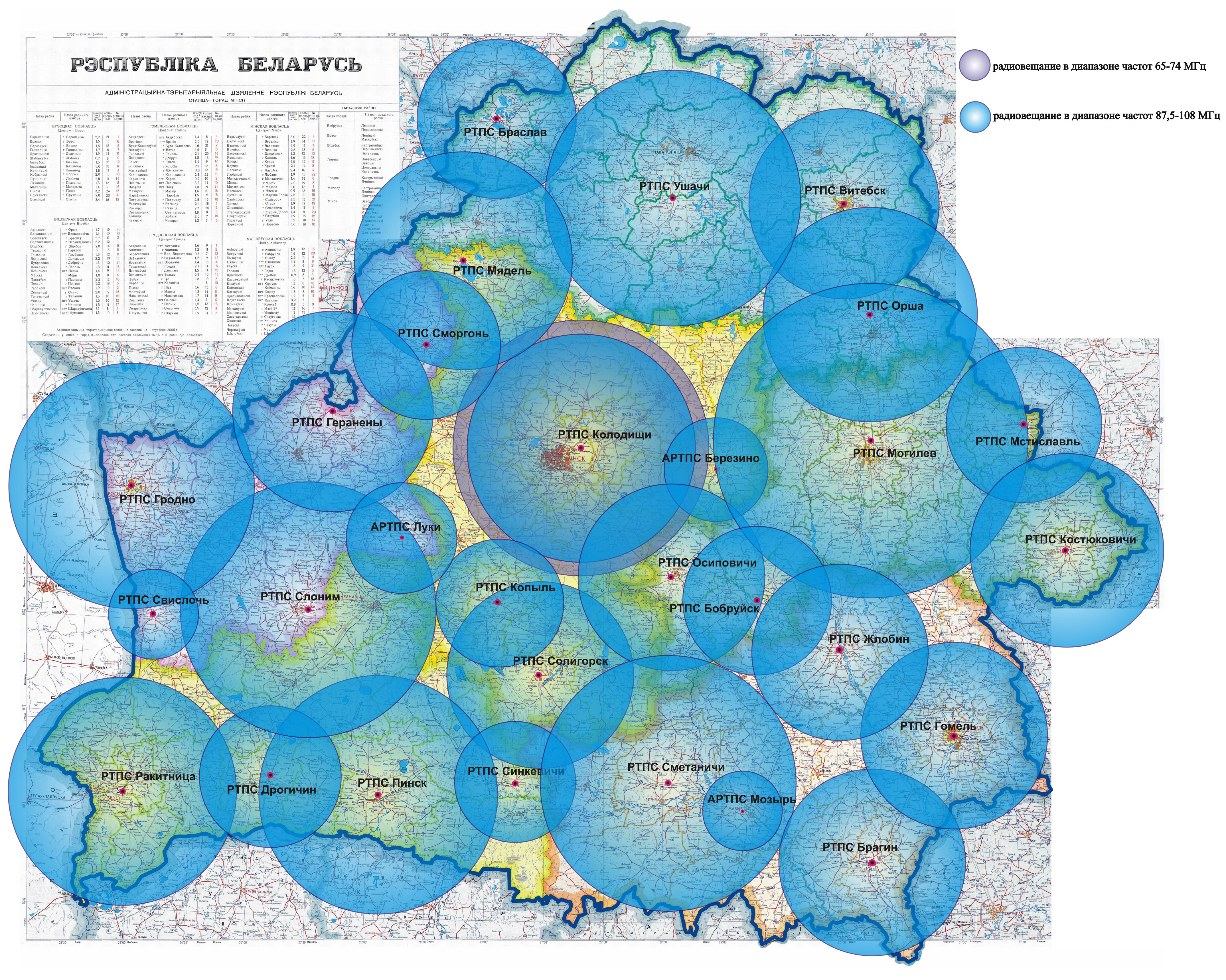 ОбластьПередающая станцияЧастота, МГцРадиус зоны охвата, кмБрестскаяРТПС Ракитница103,7066БрестскаяРТПС Дрогичин (Сиреневка)102,4041БрестскаяАРТПС Синкевичи101,0035БрестскаяРТПС Пинск (Посеничи)102,0069ВитебскаяРТПС Браслав102,3047ВитебскаяРТПС Витебск105,5055ВитебскаяРТПС Обухово (Орша)100,2062ВитебскаяРТПС Ушачи (Островенец)102,7074ГомельскаяРТПС Брагин100,8054ГомельскаяРТПС Гомель100,1054ГомельскаяРТПС Жлобин100,5051ГомельскаяАРТПС Мозырь104,8023ГомельскаяРТПС Сметаничи103,8074ГродненскаяРТПС Геранены103,3058ГродненскаяАРТПС Луки104,3035ГродненскаяРТПС Гродно100,5071ГродненскаяРТПС Свислочь96,7026ГродненскаяРТПС Слоним104,0074ГродненскаяРТПС Сморгонь101,4043МинскаяРТПС Копыль103,9045МинскаяАРТПС Березино100,7035МинскаяРТПС Колодищи72,1174МинскаяРТПС Колодищи103,7066МинскаяРТПС Мядель103,9063МинскаяРТПС Солигорск102,8054МогилевскаяРТПС Бобруйск (Ясный Лес)104,1043МогилевскаяРТПС Костюковичи102,2056МогилевскаяРТПС Могилев (Полыковичи)100,9091МогилевскаяРТПС Мстиславль102,9045МогилевскаяРТПС Осиповичи104,9054БрестскаяАРТПС Ганцевичи101,333БрестскаяАРТПС Куплин89,733ВитебскаяАРТПС Бегомль106,032ГомельскаяАРТПС Солтаново104,025Время вещания: в диапазоне 87,5-108МГц - круглосуточно; в диапазоне 66-74МГц с 05:00 до 02:00Зона охвата территории Республики Беларусь радиопрограммой "Радиус-FM": Печать