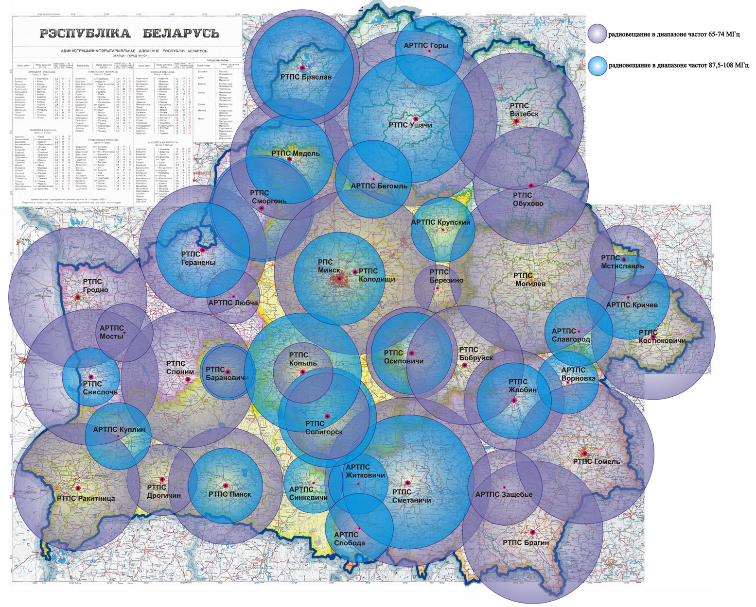 ОбластьПередающая станцияЧастота, МГцРадиус зоны охвата, кмБрестскаяРТПС Барановичи71,1824БрестскаяРТПС Барановичи93,2026БрестскаяАРТПС Пружаны (Куплин)90,3031БрестскаяРТПС Ракитница72,4759БрестскаяРТПС Дрогичин (Сиреневка)69,8033БрестскаяАРТПС Синкевичи107,8028БрестскаяРТПС Пинск (Посеничи)67,8854БрестскаяРТПС Пинск (Посеничи)94,1035ВитебскаяРТПС Браслав73,4954ВитебскаяРТПС Браслав91,1048ВитебскаяРТПС Витебск72,2663ВитебскаяРТПС Обухово (Орша)73,8254ВитебскаяАРТПС Горы104,3032ВитебскаяАРТПС Бегомль100,8036ВитебскаяРТПС Ушачи (Островенец)70,9481ВитебскаяРТПС Ушачи (Островенец)92,0059ГомельскаяРТПС Брагин69,1166ГомельскаяРТПС Гомель66,2065ГомельскаяАРТПС Защебье73,1935ГомельскаяАРТПС Ворновка106,9029ГомельскаяРТПС Жлобин71,8147ГомельскаяРТПС Жлобин90,4035ГомельскаяАРТПС Житковичи107,2028ГомельскаяАРТПС Слобода100,4032ГомельскаяРТПС Сметаничи70,2878ГомельскаяРТПС Сметаничи88,6062ГродненскаяРТПС Геранены69,2660ГродненскаяРТПС Геранены92,5044ГродненскаяАРТПС Любча70,8525ГродненскаяРТПС Гродно68,9065ГродненскаяАРТПС Мосты70,7627ГродненскаяРТПС Свислочь68,7263ГродненскаяРТПС Свислочь94,2027ГродненскаяРТПС Слоним93,8063ГродненскаяРТПС Сморгонь66,3847ГродненскаяРТПС Сморгонь94,4049МинскаяРТПС Копыль73,2228МинскаяРТПС Копыль107,3055МинскаяАРТПС Березино67,0722МинскаяАРТПС Минск (ул. Коммунистическая)105,1043МинскаяАРТПС Крупский103,0030МинскаяРТПС Колодищи72,8976МинскаяРТПС Мядель66,8656МинскаяРТПС Мядель98,5041МинскаяРТПС Солигорск68,5740МинскаяРТПС Солигорск88,4046МогилевскаяРТПС Бобруйск (Ясный Лес)73,0155МогилевскаяРТПС Костюковичи69,3858МогилевскаяАРТПС Славгород101,5032МогилевскаяРТПС Могилев (Полыковичи)71,1878МогилевскаяАРТПС Кричев107,9039МогилевскаяРТПС Мстиславль73,7332МогилевскаяРТПС Осиповичи72,4743МогилевскаяРТПС Осиповичи97,7038ГродненскаяРТПС Гродно93,322ВитебскаяРТПС Витебск96,752МогилевскаяРТПС Могилев (Полыковичи)89,645БрестскаяРТПС Брест96,918МогилевскаяАРТПС Бобруйск105,235Время вещания: в диапазоне 87,5-108МГц - круглосуточно; в диапазоне 66-74МГц с 05:00 до 02:00Зона охвата территории Республики Беларусь радиопрограммой "Столица": Печать