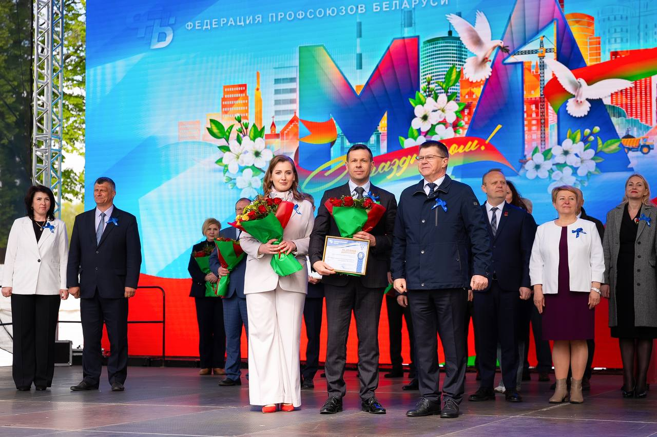 The honorary award was received by the Director General of Beltelecom Aleksei Ivashkin and the chairperson of the primary trade union organization Anastasia Lozeiko.
