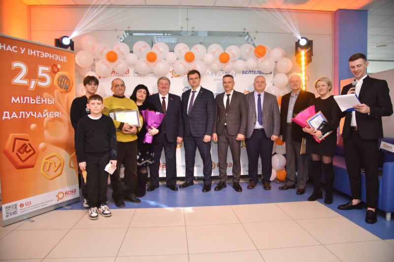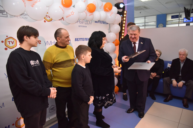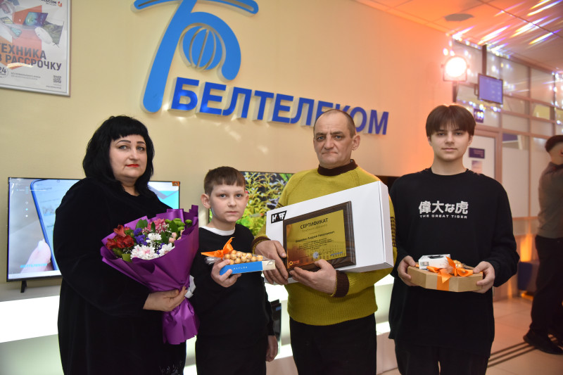 Чествование юбилейного абонента состоялось 21 марта в сервисном центре компании. Андрея и его семью приветствовал генеральный директор РУП «Белтелеком» Юрий Петрученя. В торжественной обстановке руководитель предприятия вручил сертификат Почетного абонента и подарки – ноутбук и свидетельство на право пользования пакетом услуг «ЯСНА 500 SMART» со скидкой 99% в течение одного года.