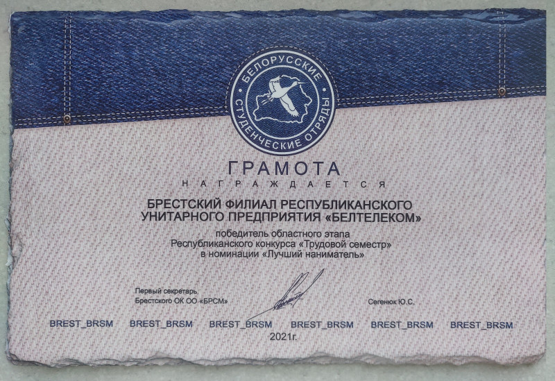 В феврале 2021 года в г. Бресте были подведены итоги деятельности студенческих отрядов. При подведении итогов Брестский филиал РУП «Белтелеком» стал победителем областного этапа Республиканского конкурса «Трудовой семестр» в номинации «Лучший наниматель».