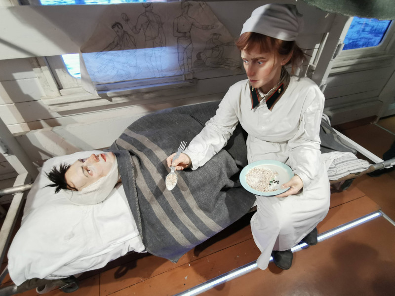 Следующий, четвёртый вагон – санитарный. В нём расположился военный госпиталь на колёсах. Врачи, медсёстры, не зная отдыха, зачастую, и вовсе без сна, ведут свою борьбу – борьбу за жизнь советских солдат. Совсем юные мужчины получают страшнейшие ранения, теряют конечности, в муках переносят операции – лекарства и обезболивающие теперь на вес золота. Но страшнее физических страданий страдания душевные…