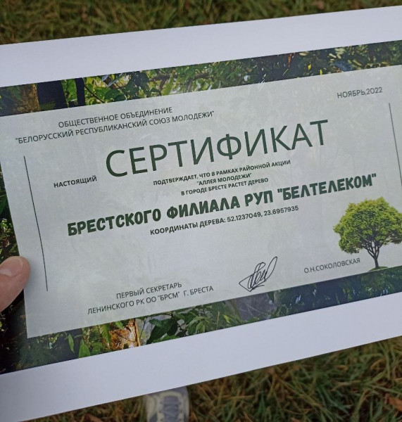 Теперь в городе Бресте растёт дерево Брестского филиала РУП "Белтелеком" со своими координатами.