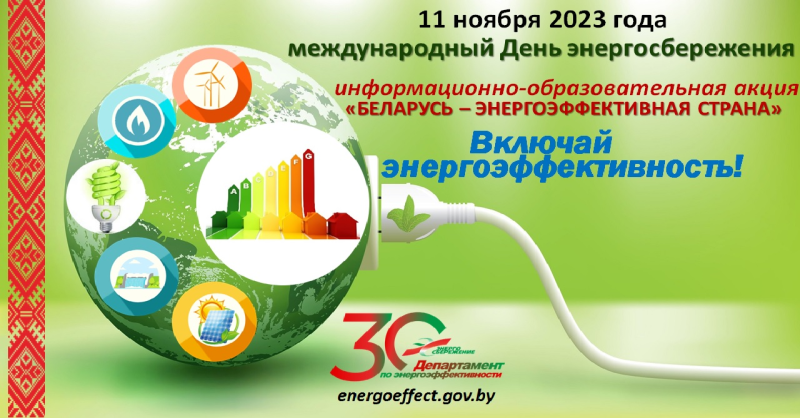 С 8 по 11 ноября 2023 года в Беларуси пройдет республиканская информационно-образовательная акция «Беларусь – энергоэффективная страна» под девизом «Включай энергоэффективность!». Она приурочена к международному Дню энергосбережения, который ежегодно отмечается 11 ноября.