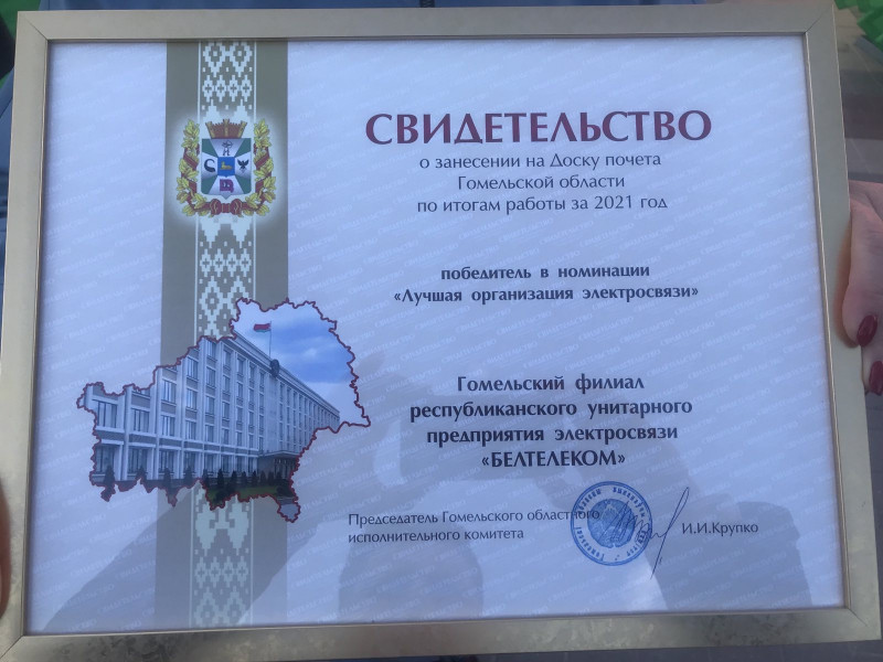 Гомельский филиал Республиканского унитарного предприятия электросвязи «Белтелеком» в тринадцатый раз занесён на Доску почёта Гомельской области как лучшая организация электросвязи, достигшая наилучших показателей в сфере социально-экономического развития и экономии ресурсов по итогам работы за 2021 год среди организаций электросвязи.