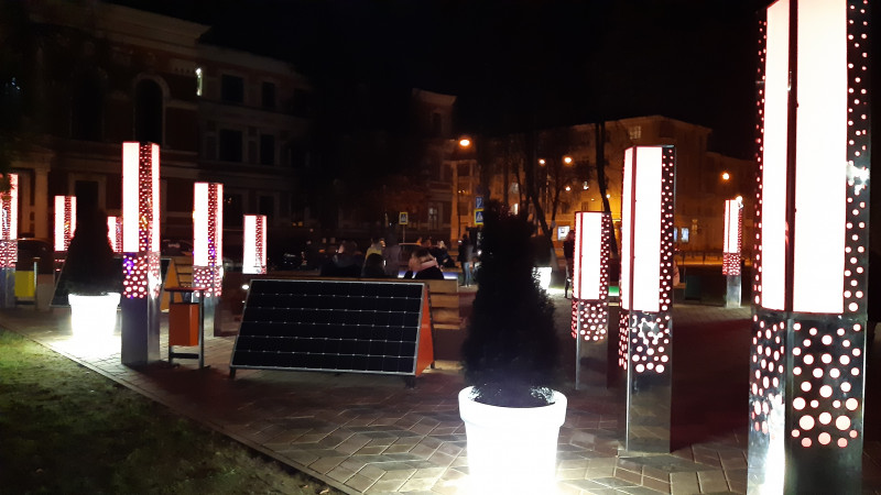 В технологичном парке установлены поющие лавочки и лавочки на солнечных батареях. Одни заряжают гаджеты, вторые исполняют любую заданную им музыкальную композицию.