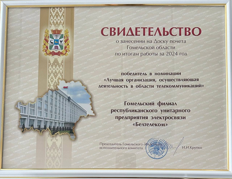 В числе победителей по итогам работы за 2024 год - Гомельский филиал РУП «Белтелеком» в номинации «Лучшая организация, осуществляющая деятельность в области телекоммуникаций».