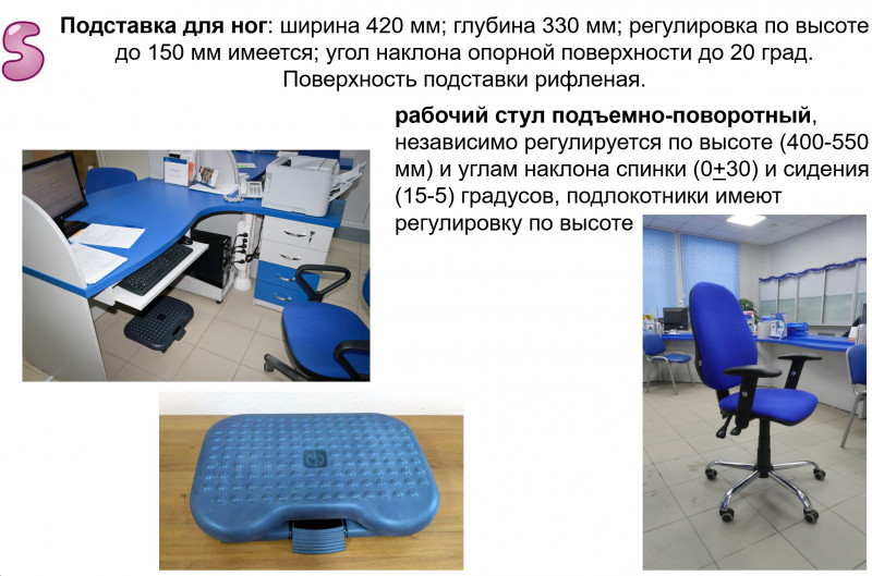 Каждое рабочее место имеет удобную подставку для ног: ширина 420 мм; глубина 330 мм; регулировка по высоте до 150 мм имеется; угол наклона опорной поверхности до 20 град. Поверхность подставки рифленая.
