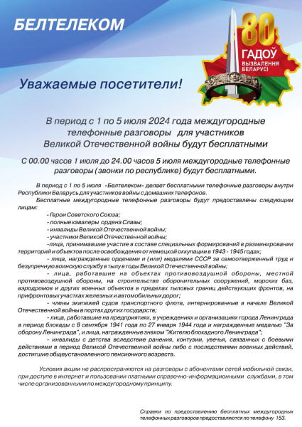 Бесплатные междугородные телефонные разговоры внутри Республики Беларусь предоставляются в период празднования 80-й годовщины освобождения Республики Беларусь от немецко-фашистских захватчиков c 00.00 часов 01.07.2024 до 24.00 часов 05.07.2024 автоматическим способом с квартирных телефонов.