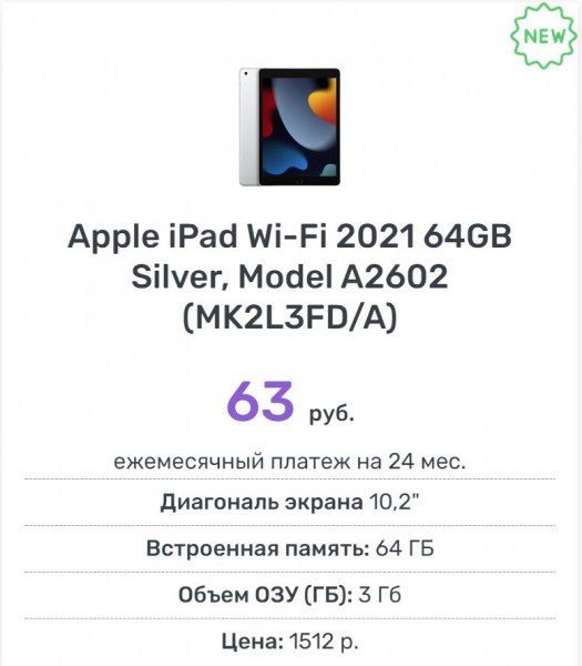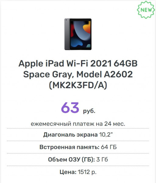 🌟 Apple iPad Wi-Fi 2021 64GB (два цвета на выбор Space Gray и Silver) Model A2602 (MK2K3FD/A) 63 руб. ежемесячный платеж на 24 мес. (диагональ экрана 10,2", встроенная память: 64 ГБ, объем ОЗУ (ГБ): 3 Гб, цена: 1512 р.)