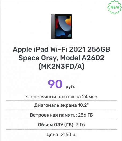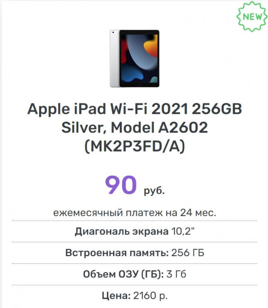 🌟 Apple iPad Wi-Fi 2021 256GB (два цвета на выбор Silver и Space Gray), Model A2602 (MK2P3FD/A) 90 руб. ежемесячный платеж на 24 мес. (диагональ экрана 10,2", встроенная память: 256 ГБ, объем ОЗУ (ГБ): 3 Гб, цена: 2160 р.)