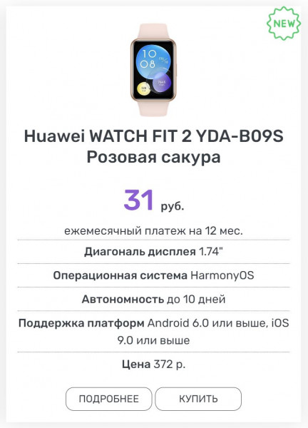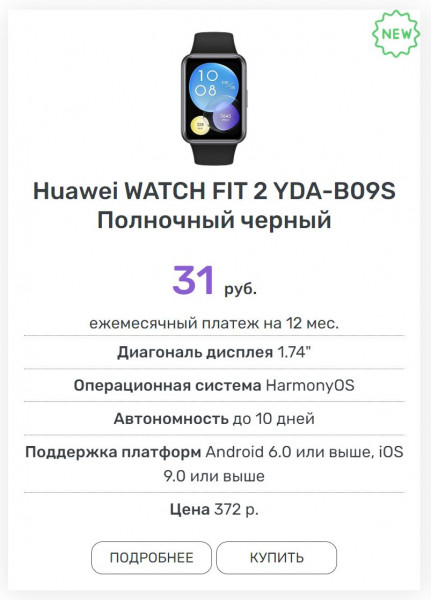 1) Huawei WATCH FIT 2 YDA-B09S черный и розовый (2 расцветки) - 31 руб/мес в рассрочку на 12 мес., полная цена 372 руб.