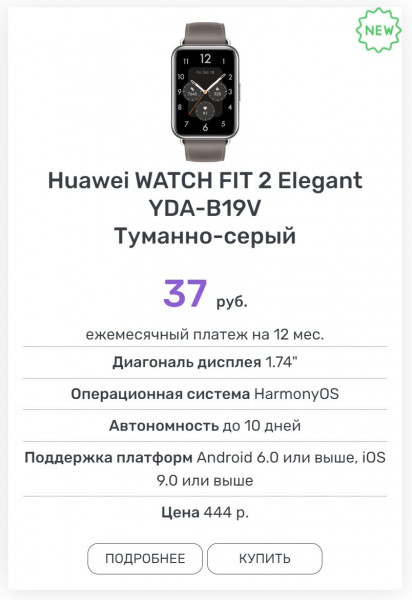 2) Huawei WATCH FIT 2 Elegant YDA-B19V серый - 37 руб/мес в рассрочку на 12 мес., полная цена 444 руб.