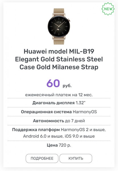 3) И модель более дорогого сегмента: Huawei model MIL-B19 Elegant Gold Stainless Steel Case Gold Milanese Strap - 60 руб/мес в рассрочку на 12 мес., полная цена 720 руб.