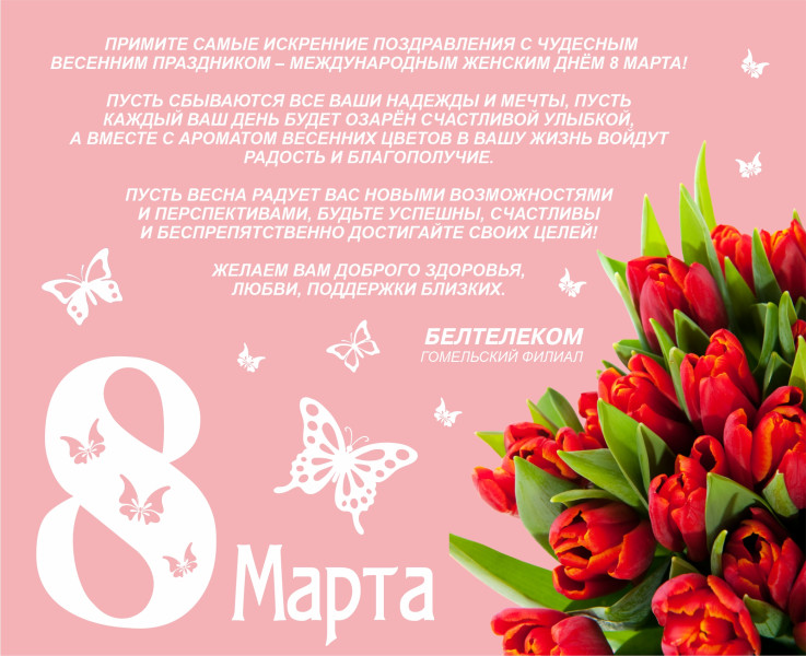 От имени коллектива Гомельского филиала РУП «Белтелеком» и от меня лично примите самые искренние поздравления с чудесным весенним праздником – Международным женским днём 8 Марта!