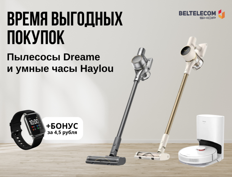 В сервисных центрах "Белтелеком" и на shop.beltelecom.by действует выгодное предложение! При покупке любого из пылесосов Dreame Вы получите бонус – умные часы Haylou LS02 всего за 4,5 рубля. Пылесосы Dreame доступны для приобретения в рассрочку на 18 месяцев для абонентов "Белтелеком"*.