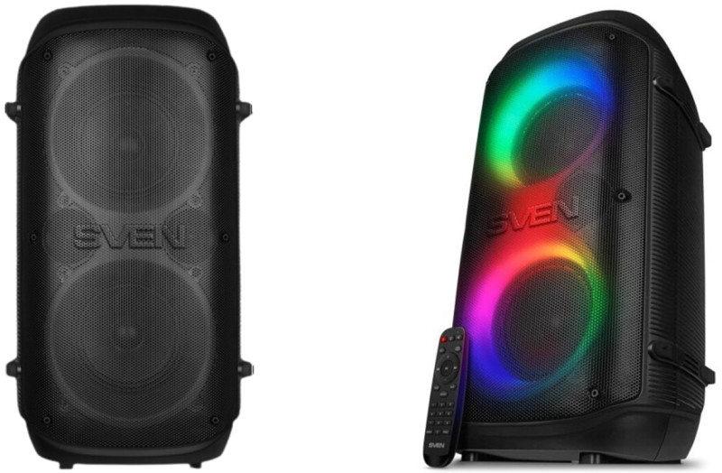 Sven PS-800 – это не карманное устройство, а серьезный мобильный музыкальный центр. Его размеры – 312×325×568 мм, а масса – чуть более 5 кг. При этом перенести устройство с места на место не составит труда: есть удобная ручка, а прочный пластиковый корпус выдержит постоянную транспортировку. Располагать колонку можно как вертикально, так и горизонтально – устойчивые ножки размещены на дне и боковых стенках устройства.