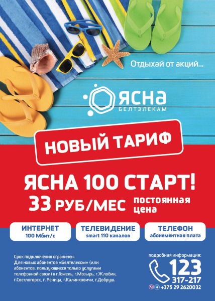 Подключение к пакету «ЯСНА 100 старт» ограничено и возможно только по 20.09.2023 включительно в г.Гомель, г. Калинковичи, г. Мозырь, г. Речица, г. Светлогорск, г. Жлобин, г. Добруш, ряде населенных пунктов Гомельского района.