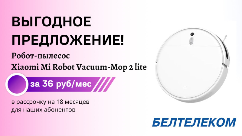 В сервисных центрах «Белтелекома» действует акционное предложение на робот-пылесос Xiaomi Mi Robot Vacuum-Mop 2 Lite. Абоненты компании* могут приобрести его в рассрочку на 18 месяцев всего за 36 рублей в месяц.