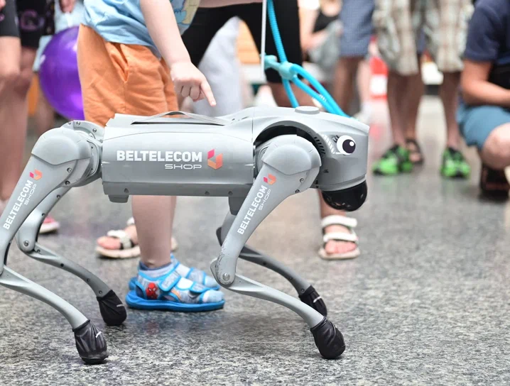 Пока взрослые изучали условия и цены, ребятишки развлекались в холле, где играл баянист, работало селфи-зеркало, танцевала огромная плюшевая капибара и робот-собака.