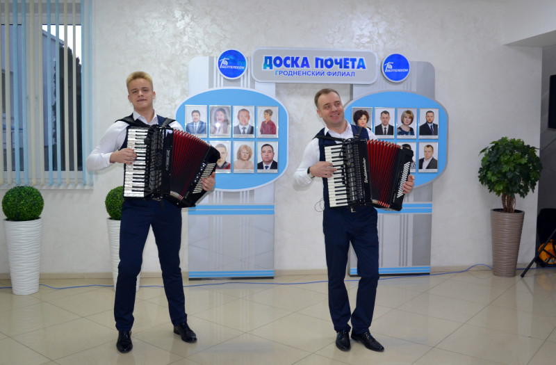 На экране была размещена композиционная заставка с цветами, а фойе два очаровательных аккордеониста играли популярные мелодии.