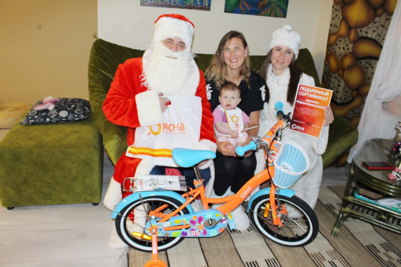 Ясне Романенко (7 месяцев) подарили велосипед в непринужденной домашней обстановке. Сотрудники филиала нарядились в костюмы деда Мороза и Снегурочки – что вызвало полный восторг у малышки.