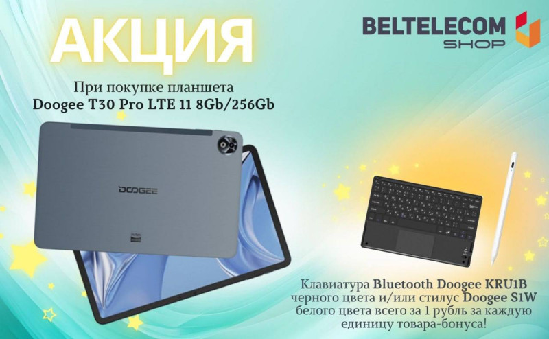 При покупке планшета Doogee T30 Pro LTE 11 8Gb 256Gb вы можете дополнительно приобрести клавиатуру Bluetooth Doogee KRU1B и/или стилус Doogee S1W всего за 1 рубль за каждую единицу товара-бонуса!