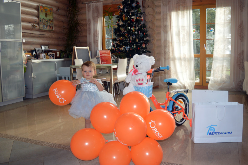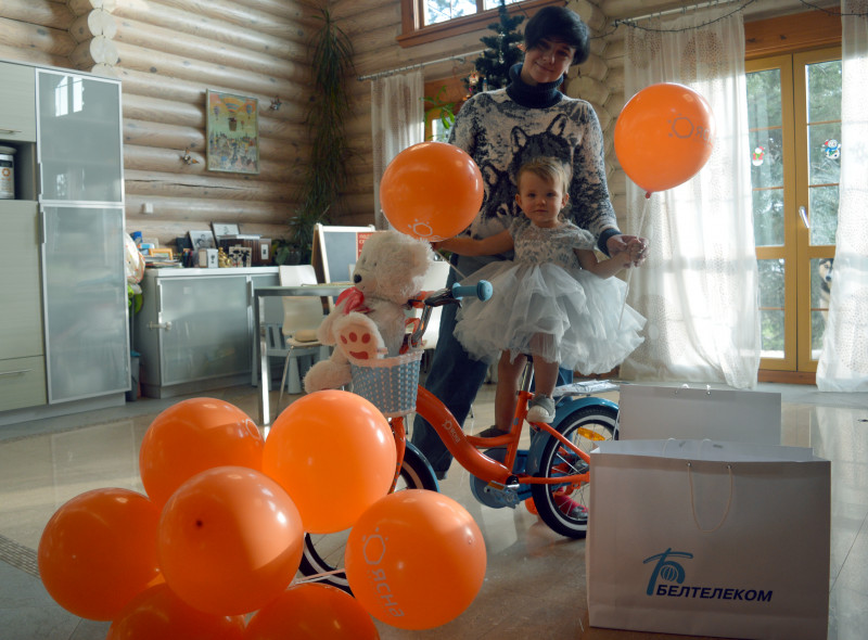 Для малышки бренд ЯСНА в качестве подарка подготовил велосипед, а родителям - сертификат на право подключения пакета услуг «Ясна 100» со скидкой 100% за первый месяц с даты поздравления и 50% в течение последующих 11 месяцев. Подарки вручил начальник Минского районного цеха электросвязи Александров Александр Владимирович.